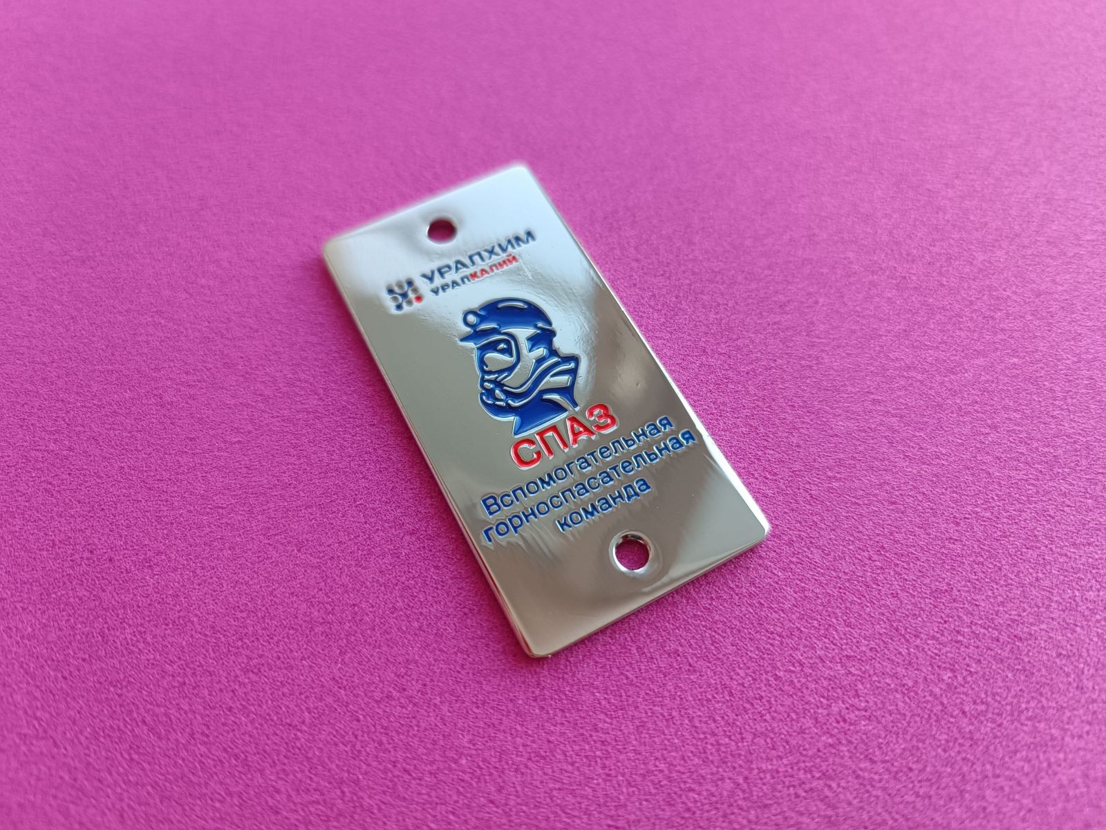 Одна из организаций г. Перми, помогающая продвигать товары и услуги, решила заказать жетон на тему ВГК – вспомогательной команды горноспасателей СПАЗ ПАО «Уралкалий». Изделие с фирменной символикой выполнено для рекламного агентства в 2025 г., оно служит опознавательным знаком для сотрудников и информирует об их связи с известным производителем минеральных удобрений.