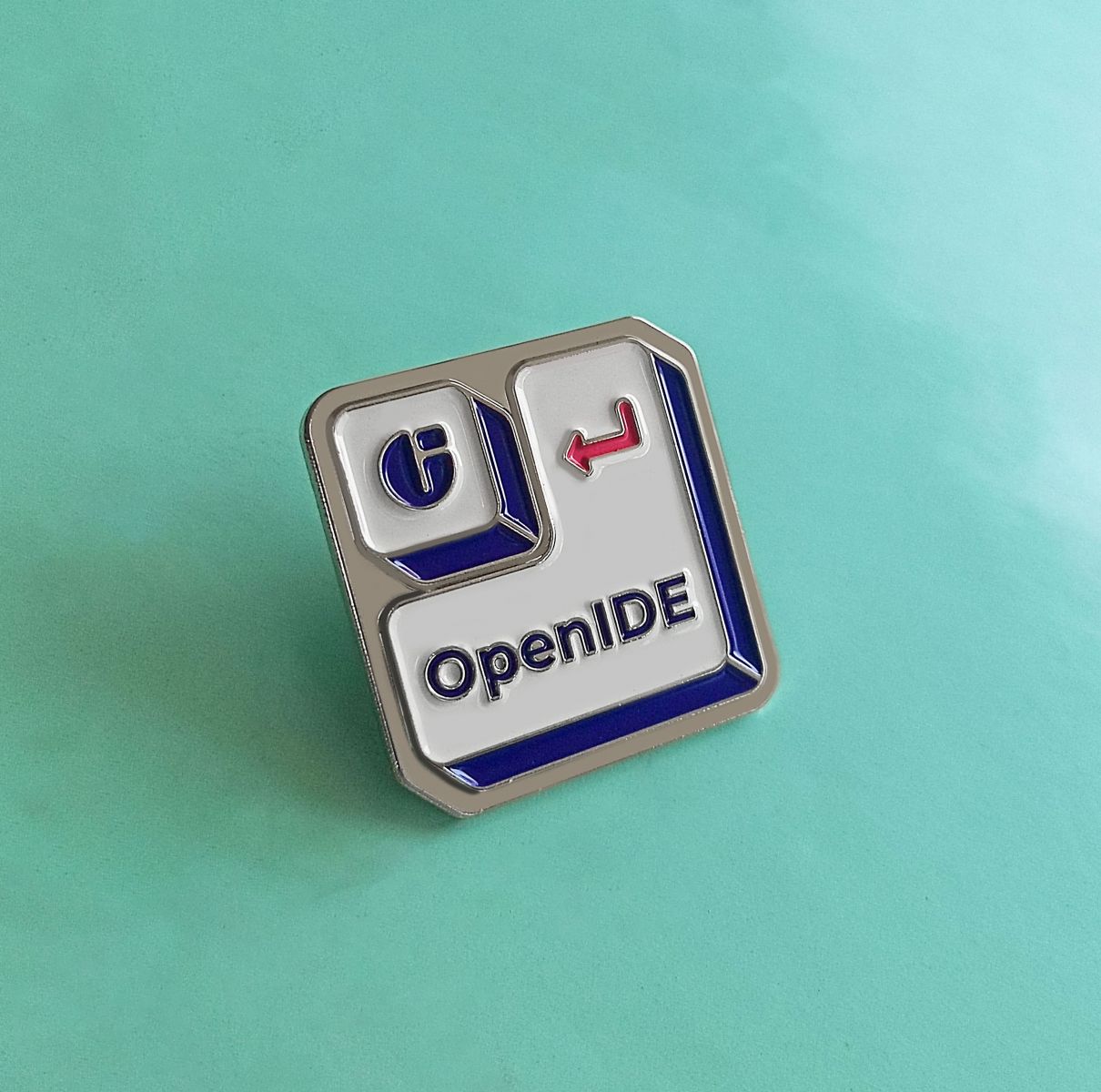 · Большая часть лицевой стороны занята г-образной картинкой, имитирующей кнопку клавиатуры «Enter». Для придания объёма боковины элемента окрашены тёмно-синей с черничным оттенком эмалировкой, передняя плоскость – белой. В горизонтальном секторе «клавиши» на значки из металла нанесено наименование «OpenIDE». В вертикальном ответвлении расположена изогнутая розовато-малиновая стрелка.