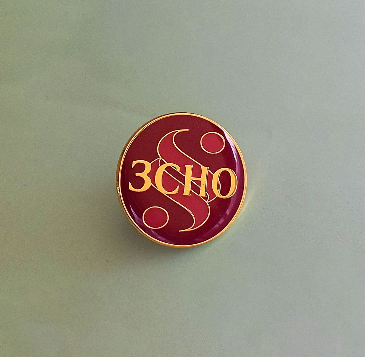 · Как и предписывает техническое задание на производство значков, на заднем плане аббревиатуры нанесена фирменная эмблема. Сюжет включает пару параллельных S-образных графических элементов бордово-розовой тональности, наклонённых верхней дугой влево. Справа и слева от срединных участков изгибов в окружении бордового фона располагаются аналогичной обработки кружки. Контуры символов очерчены тонкой линией золочения.