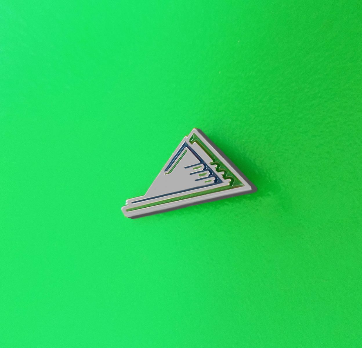 · Плоскость внутренней геометрической фигуры декорирована серебрением, разделяющимся в зоне правого острия на три дорожки с зелёными штрихами. Рядом с частью левого скоса (вверху) тянется пара параллельных дорожек с синей и зелёной окраской, синева плавно перетекает к правому борту.